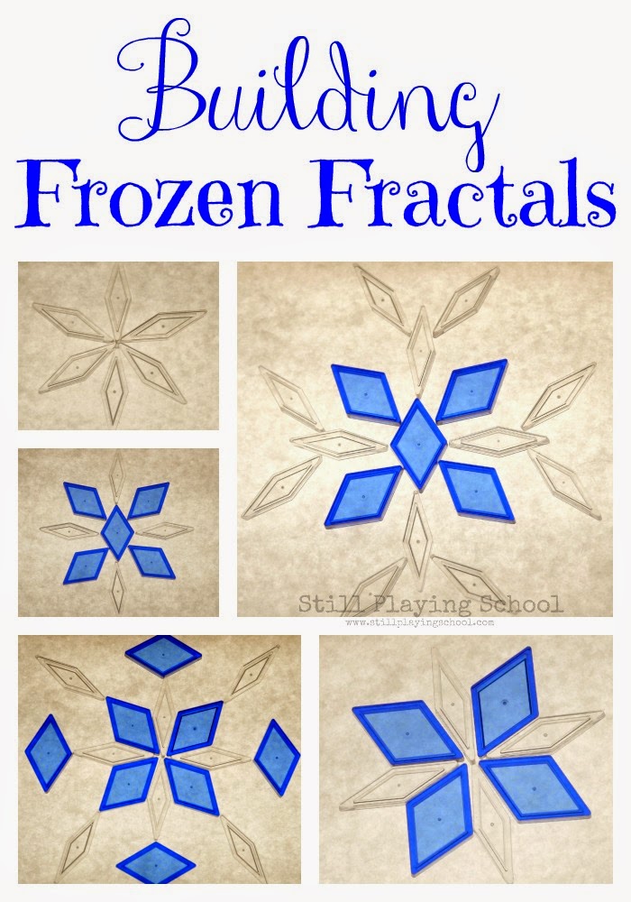 After taking E to see Frozen as a reward for getting shots, we were inspired to make snowflakes on the light table! I love this pretty math and nature lesson that includes symmetry and geometry.