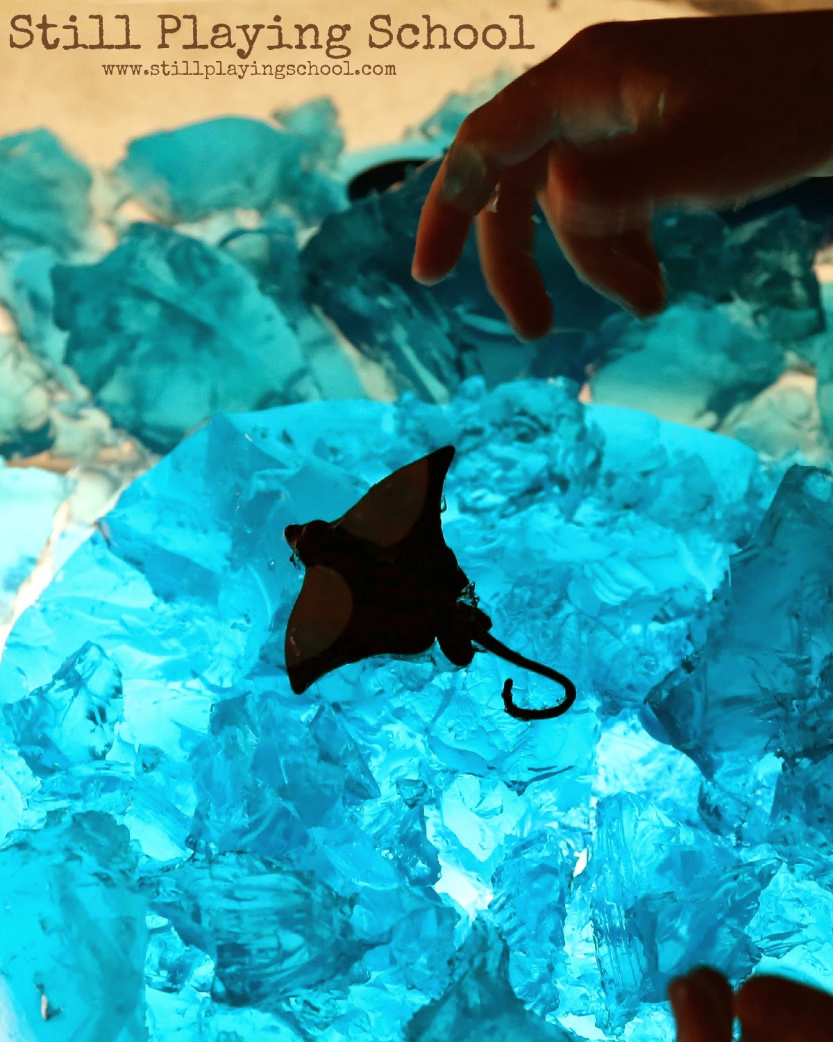 Once we put the gelatin ocean world on our light table we were all impressed with the effect! After a few minutes of admiring our creation and looking at all the creatures swimming within the depths, I let our preschooler dig in, literally.