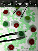 These spooky spider webs are a creative way to craft fine motor fun for Halloween. Use them for a color matching activity. Alternatively you can make and play with these without the black light but we just love kids' activities that glow!
